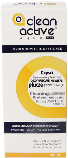 A Clean Active Aqua Plus egy olyan modern és multifunkcionális ápolószer, ami minden típusú lágy kontaktlencséhez használható. Feladatai közé tartozik a lencse fertőtlenítése, tisztítása és hidratálása - így használata kényelmes és biztonságos a lencse lejárati idejétől függetlenül. Ez a termék a webáruházunkban is megtalálható Clean Active Aqua ápolószer újabb verziója.   Továbbfejlesztett összetétel - az új generációs Clean Active Aqua Plus folyadék nátrium-hialuronátot tartalmaz, így gyorsabban hat. A webáruházunkban is megtalálható Clean Active Aqua újabb verziója. Teljeskörű hidratáció - a Clean Active Aqua Plus rendszeres használata garantálja a tökéletesen hidratált lencséket, így a teljes viselési idő alatt észrevehetetlen marad a lencse, és nem okoz szemszárazságot. Tárolás huzamosabb ideig - a friss ápolószerrel megtöltött folyadékban több napon keresztül is tárolhatja a lencsét. A lencsét így nem éri szennyeződés, és megtartja értékes tulajdonságait. Alapos tisztítás - a folyadék alaposan fertőtleníti a lencséket, eltávolítja a felületén lerakódott szennyeződéseket, amelyek növelik a potenciális gyulladás kockázatát. Továbbá eltávolítja a fehérje- és zsírlerakódásokat és a baktériumokat.   Gyors hatóidő - a Clean Active Aqua Plus 5-7 percen belül megtisztítja és hidratálja a lencsét. Ezáltal tökéletes azoknak, akik időt szeretnének megtakarítani.   A Clean Active Aqua Plus ápolószer jellemzői:   A Clean Active Aqua Plus feltehetően a lágy lencséhez elérhető egyik legjobb ápolószer a lengyel piacon. Továbbfejlesztett összetétel jellemzi, ami magas fokú hidratációt eredményez - ez leginkább a nátrium-hialuronátnak köszönhető. A gyors hatóidő is említésre méltó: 5-7 perc eltelte után már hatásos. A Clean Active Aqua Plus elsősorban tisztítja és fertőtleníti a kontaktlencsét. Eltávolítja a nap folyamán a lencse felületén felhalmozódott fehérjét, zsírlerakódásokat, szennyeződéseket és a veszélyes mikroorganizmusokat. A Clean Active Aqua Plus folyadékkal megtisztított lencse ezután ismét biztonságosan használható. Nem áll fenn gyulladás vagy irritáció kockázata. Az ápolószerben tárolt lencse visszanyeri a kezdeti hidratációs szintjét, és ismételten hidratált lesz - ezáltal észrevehetetlen a szemben, és kényelmes a viselése. A behelyezést követően még számos órán keresztül megtartja nedvességét. Enyhíti a por, pollenek, levegő-szennyeződés okozta irritációt. Kíméletes a szemmel azonnal enyhíti az irritációs problémákat. Az Clean Active Aqua Plus  védi a szemet a szennyeződésektől és a fehérje lerakódásoktól. A Clean Active Aqua Plus egy olyan modern és multifunkcionális ápolószer, ami minden típusú lágy kontaktlencséhez használható. Feladatai közé tartozik a lencse fertőtlenítése, tisztítása és hidratálása - így használata kényelmes és biztonságos a lencse lejárati idejétől függetlenül. Ez a termék a webáruházunkban is megtalálható Clean Active Aqua ápolószer újabb verziója.   Fogalmazás: polihexanid biguanidok 0,0001%; 0,1% dinátrium-edetát; 0,01% nátrium-hialuronát; készítve 100% segédanyagokkal és tisztított vízzel.   A termék csomagban is elérhető: Clean Active Aqua Plus 500 ml