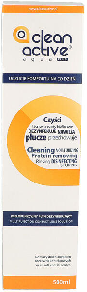 A Clean Active Aqua Plus egy olyan modern és multifunkcionális ápolószer, ami minden típusú lágy kontaktlencséhez használható. Feladatai közé tartozik a lencse fertőtlenítése, tisztítása és hidratálása - így használata kényelmes és biztonságos a lencse lejárati idejétől függetlenül. Ez a termék a webáruházunkban is megtalálható Clean Active Aqua ápolószer újabb verziója.   Továbbfejlesztett összetétel - az új generációs Clean Active Aqua Plus folyadék nátrium-hialuronátot tartalmaz, így gyorsabban hat. A webáruházunkban is megtalálható Clean Active Aqua újabb verziója. Teljeskörű hidratáció - a Clean Active Aqua Plus rendszeres használata garantálja a tökéletesen hidratált lencséket, így a teljes viselési idő alatt észrevehetetlen marad a lencse, és nem okoz szemszárazságot. Tárolás huzamosabb ideig - a friss ápolószerrel megtöltött folyadékban több napon keresztül is tárolhatja a lencsét. A lencsét így nem éri szennyeződés, és megtartja értékes tulajdonságait. Alapos tisztítás - a folyadék alaposan fertőtleníti a lencséket, eltávolítja a felületén lerakódott szennyeződéseket, amelyek növelik a potenciális gyulladás kockázatát. Továbbá eltávolítja a fehérje- és zsírlerakódásokat és a baktériumokat.   Gyors hatóidő - a Clean Active Aqua Plus 5-7 percen belül megtisztítja és hidratálja a lencsét. Ezáltal tökéletes azoknak, akik időt szeretnének megtakarítani. Gazdaságos kiszerelés - a Clean Active Aqua Plus 500 ml-es kiszerelésben érhető el. Ez pontosan megfelelő kiszerelés ahhoz, hogy feltöltsük otthoni készletünket egy magas minőségű ápolószerrel.   A Clean Active Aqua Plus ápolószer jellemzői:   A Clean Active Aqua Plus feltehetően a lágy lencséhez elérhető egyik legjobb ápolószer a lengyel piacon. Továbbfejlesztett összetétel jellemzi, ami magas fokú hidratációt eredményez - ez leginkább a nátrium-hialuronátnak köszönhető. A gyors hatóidő is említésre méltó: 5-7 perc eltelte után már hatásos. A Clean Active Aqua Plus elsősorban tisztítja és fertőtleníti a kontaktlencsét. Eltávolítja a nap folyamán a lencse felületén felhalmozódott fehérjét, zsírlerakódásokat, szennyeződéseket és a veszélyes mikroorganizmusokat. A Clean Active Aqua Plus folyadékkal megtisztított lencse ezután ismét biztonságosan használható. Nem áll fenn gyulladás vagy irritáció kockázata. Az ápolószerben tárolt lencse visszanyeri a kezdeti hidratációs szintjét, és ismételten hidratált lesz - ezáltal észrevehetetlen a szemben, és kényelmes a viselése. A behelyezést követően még számos órán keresztül megtartja nedvességét. A friss Clean Active Aqua Plus folyadékkal feltöltött tároló nem csak akkor megfelelő választás, ha pár órán belül vagy reggel újra viseli a lencsét, hanem akkor is, ha pár napig nem szeretné hordani. A folyadékban nem éri szennyeződés a lencsét, így megtartja értékes tulajdonságait, és bármikor készen áll a viselésre. A Clean Active Aqua Plus ezen előnyével pénzt spórolhat - nem kell kidobni egy pár lencsét azért, mert pár napon keresztül nem fogja viselni; biztonságosan tárolhatja. A Clean Active Aqua Plus egy koncentrált formula. Ennek köszönhetően pár percen belül tisztítja, fertőtleníti és hidratálja a lencsét. A termék tökéletes választás azoknak, akik a leggyorsabb hatóidőt szeretnék elérni, és ezáltal időt spórolni. A továbbfejlesztett összetételének köszönhetően az ápolószer érzékeny szem esetén is használható. A termék ISO 9001: 2000 és ISO 13485-2003 minőségbiztosításokkal rendelkezik. A termék gyártója a híres Polytouch Chemical cég. A Clean Active Aqua Plus 500 ml-es kiszerelésben érhető el. Ezáltal feltölthetjük otthoni készletünket egy magas minőségű termékkel. Tökéletes továbbá azok számára, akik rendszeren viselnek lencsét, és minden nap használnak ápolószert, de nem szeretnének túl gyakran vásárolni.   Fogalmazás: polihexanid biguanidok 0,0001%; 0,1% dinátrium-edetát; 0,01% nátrium-hialuronát; készítve 100% segédanyagokkal és tisztított vízzel.   A termék csomagban is elérhető: Clean Active Aqua Plus 100 ml