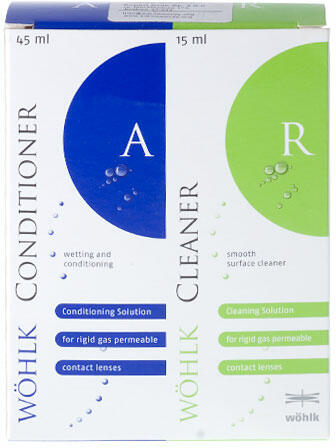 A Wöhlk Perfect Conditioner & Cleaner kétfázisú folyadék kemény és ortho-korrekciós lencsék (stabil) tisztítására és tárolására. Az optikai ipar egyik vezető gyártójától származik, a német Zeiss gyártótól.   A Wöhlk Perfect Cleaner & Conditioner jellemzői:   A Wöhlk Perfect Conditioner & Cleaner kétfázisú folyadék kemény lencséhez. Átfogó ápolást nyújt - eltávolítja a fehérje lerakódásokat, tisztít, fertőtlenít és hidratál. Pufferált, izotóniás folyadék, nem tartalmaz tiomerzált. A Wöhlk Perfect biztonságos a szem számára, nem okoz allergiát, sem irritációt, valamint a lencse felszínét sem sérti.   Hogyan használja a Wöhlk Perfect Cleaner és a Wöhlk Perfect Conditioner folyadékokat?   A kétfázisú folyadék jobban teljesít, mint egy minden az egyben folyadék. Mindkét fázisra jut egy külön folyadék: Wöhlk Perfect Cleaner - ez az első fázis a kétfázisú folyadék esetén. Tisztít, és tökéletesen eltávolítja a szennyeződést és a fehérje lerakódásokat. Mechanikusan tisztítja a lencsét. Wöhlk Perfect Conditioner - ez a második lépés. Tárolásra ajánlott. Tökéletesen hidratálja, és fertőtleníti a kemény lencsét, valamint kényelmet és higiéniát biztosít.   A Wöhlk Perfect Conditioner & Cleaner folyadékok összetevői:   Hidroxipropil-metil-cellulóz, poloxamer, 0,1% EDTA, 0,0004% Polihexetilén-Biguanid pufferált, izotóniás folyadékban.